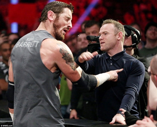 Manchester United and England captain, Wayne Rooney theatrically slapped 6ft 7in WWE superstar, Briton Wade Barrett in front of thousands of fans during a ringside stand-off last night at the Manchester Arena after the wrestler trash talked him.